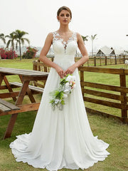 Charming A-Line Illusion Neck Sleeveless Lace Back Train Wedding Dresses