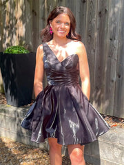 This dark gray satin short back to school dress features a heart-shaped collar and shoulder design, with a slim fit waist and fluffy skirt to optimize body proportions. The satin material has a high-end luster, and the side pocket design combines beauty and practicality. The mini length is suitable for back to school dances, parties, and other occasions, showcasing dry elegance.