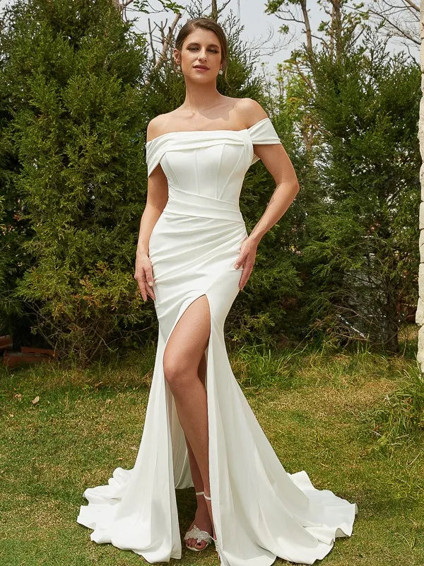 Chic Mermaid Off-The-Shoulder Slit Back Train Wedding Dresses