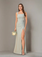 This mint green tight bridesmaid dress presents an elegant temperament with pleated fabric, square neckline and wide shoulder straps adorning the shoulders and neck, side slits adding agility, and a delicate and eye-catching butterfly bow hollow design on the back. The slim fit fits the body and is suitable for formal occasions such as weddings, making it the preferred choice for neat and gentle styling.
