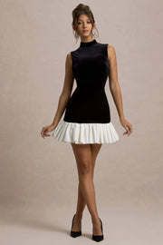 This black and white contrasting short dress features a delicate and sleek Sheath silhouette, with a stand up sleeveless design paired with velvet material to enhance the vintage feel. The black and white stitching and ruffled hem add visual layers, and the back zipper design is easy to put on and take off. The slim fit fits the body and is suitable for semi formal occasions such as back to school dances, making it an elegant and eye-catching styling choice.