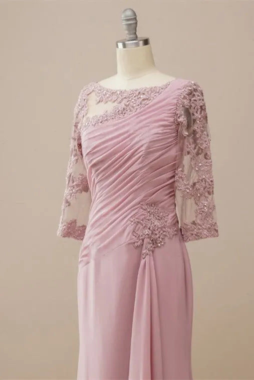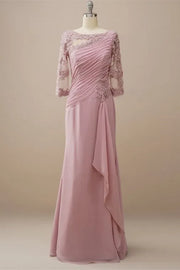 This light pink dress presents a gentle and elegant temperament with a Mermaid silhouette, featuring an asymmetrical collar and lace half sleeves to embellish the shoulders and neck. The lightweight chiffon fabric is paired with pleats on the chest and back, and the layered skirt fits the curves of the body. It is suitable for weddings, dinners, and other occasions, making it an exquisite choice for brides and mothers.