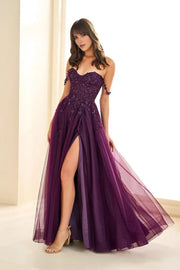 Step into fashionable with Sjzca's A-line style prom dress It features an off-shoulder design, a sweetheart neckline, intricate lace embellishments on the bodice, a high-slit skirt, and functional pockets. Crafted from delicate tulle fabric, the gown in deep purple exudes romance and sophistication, making it perfect for evening events, formal galas, and special occasions.
