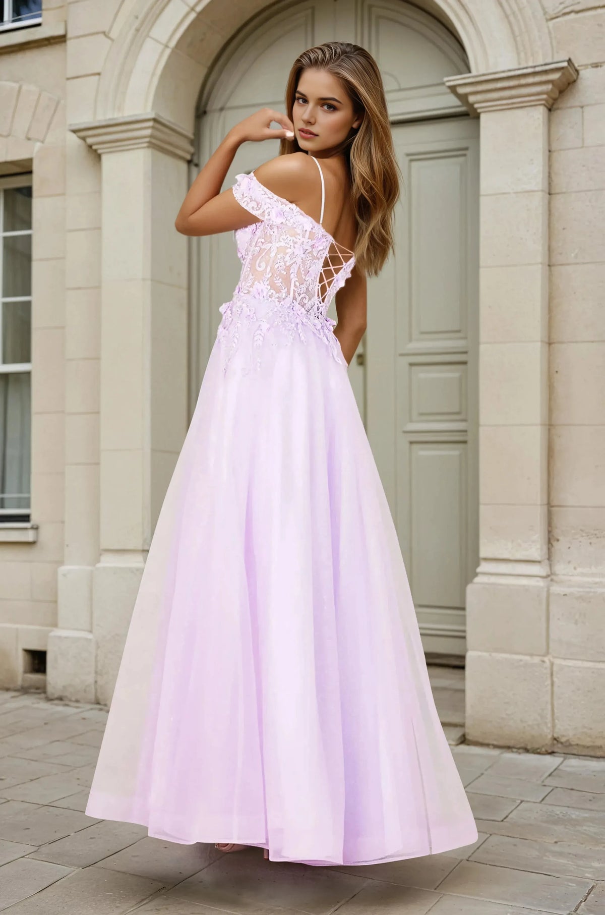 Step into charming with Sjzca's A line - style prom dress. It features spaghetti straps, an off-shoulder design, intricate lace detailing on the bodice, delicate floral embroidery, and flowing tulle fabric. Crafted from soft light blue tulle with lace and floral accents, the gown exudes romantic sophistication and allure, making it perfect for evening events, formal galas, and special occasions.