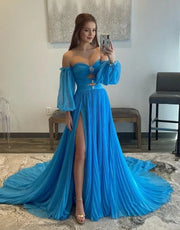 Elegant A-Line Off the Shoulder Long-Sleeve Tulle Embellished Back Zip High-Slit Floor-Length Prom Dress With Detachable Sleeves