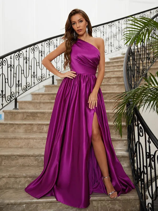 This deep purple satin dress features an A-line silhouette to create a light and airy atmosphere, with an elegant and bright one shoulder sleeveless design. The satin material has a soft and glossy finish, and the cinched waist and split hem embellish the curves, making it suitable for occasions such as dinners and weddings, showcasing a gentle and atmospheric temperament.