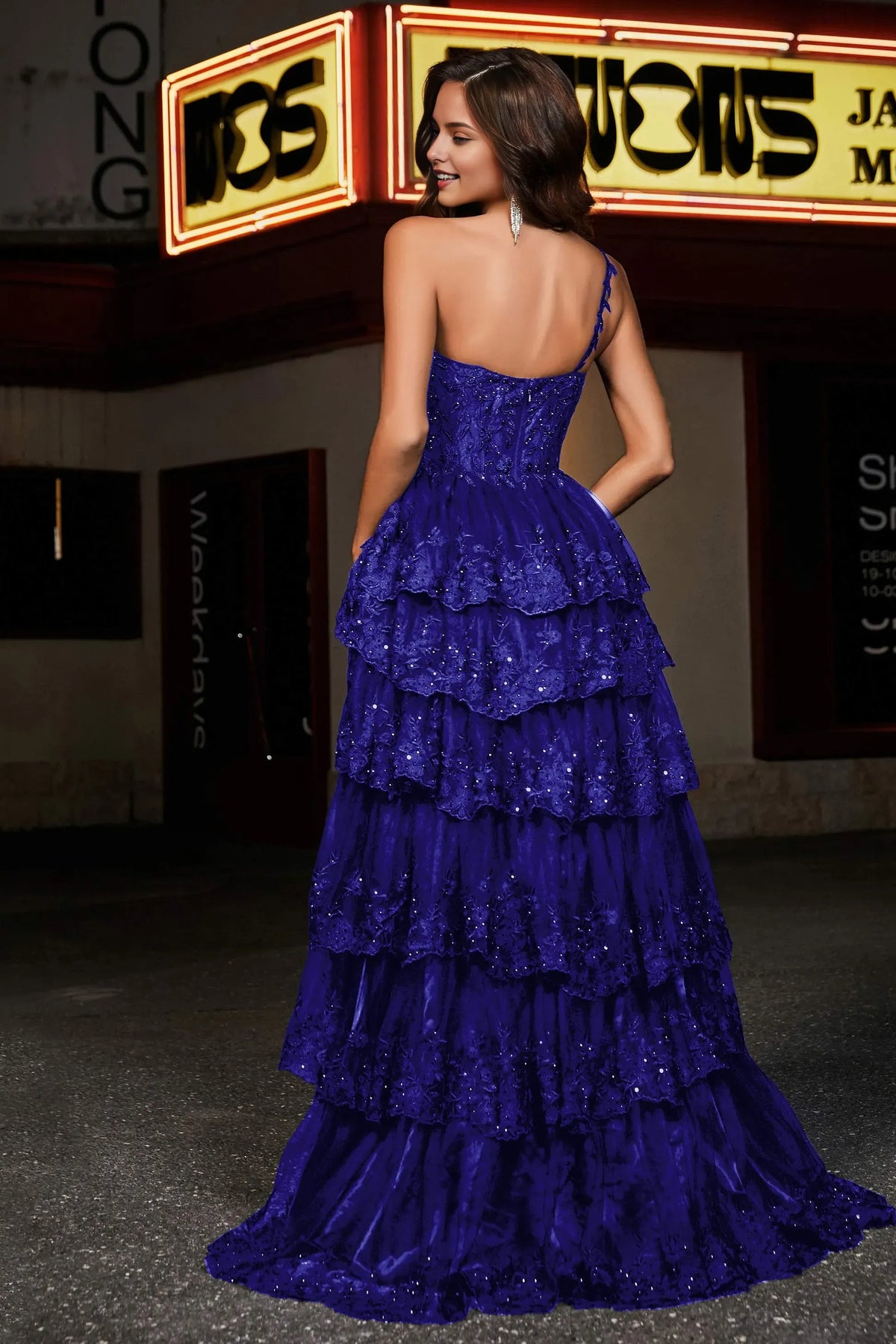 Step into fashionable with Sjzca's exquisite prom dress. It features a A-line silhouette that offers a voluminous fit, a one-shoulder neckline, and sleeveless design that highlights the shoulders. The tiered ruffle skirt with intricate lace and sequin details creates a glamorous look, while the floor-length design brings a sense of grandeur. Perfect for evening events, this dress lets you radiate sophistication and charm.
