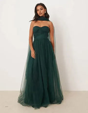 Step into elegance with Sjzca's A-line - style prom dress. It features a strapless design, a dramatic tulle cape overlay, and a floor - length silhouette crafted from layers of ethereal tulle fabric. The gown in rich emerald green exudes romance and sophistication, making it perfect for weddings, formal events, and special occasions.