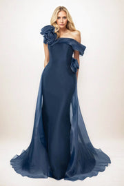 This deep blue fishtail bride's mother dress is made of satin and light gauze, presenting a high-end temperament. The off shoulder design decorates the shoulders and neck, and the three-dimensional flower decoration adds a delicate feeling. The slim fit fits the body shape, and the large skirt is flexible and flowing, suitable for formal occasions such as weddings. It is an elegant and atmospheric choice for styling.