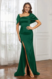 Elegant Dark Green Mermaid One The Shoulder Strapless Back Zip Ruched Satin Slit Floor-Length Prom Dresses With Slit