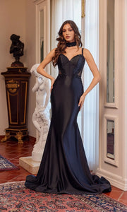 This deep black mermaid dress features a heart-shaped neckline with thin shoulder straps, adorned with pearl embellishments and sheer mesh patchwork, paired with a matching color collar decoration. The silk fabric has a high-end luster, and the trailing skirt is suitable for formal occasions such as parties and dinners, showcasing luxury and mystery.