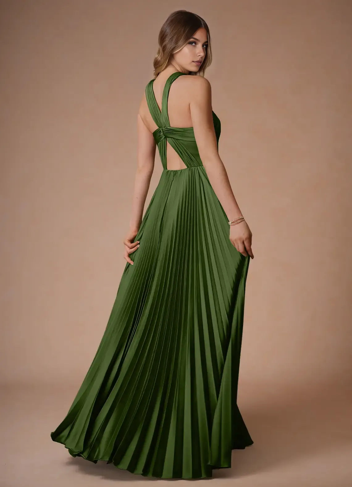 Fashionable Olive Green A-Line Halter Neck Sleeveless Crisscross Pleated Slit Floor-Length Prom Dresses - US 2 / UK 6/ EU 32