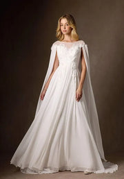 This white A-line dress presents a dreamy and fairy like temperament with a flowing silhouette, featuring a translucent round neck and a detachable chiffon cape design that is lively and romantic. The chiffon fabric is paired with exquisite lace decoration, and the V-neck design on the back is simple and elegant, suitable for fairy tale style indoor weddings, ceremonies, and other occasions. It is the preferred choice for fairy like styling.
