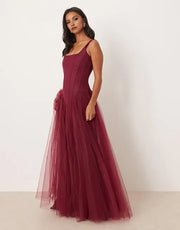 Step into fashionable with Sjzca's A-line - style prom dress. It features a square neckline, sleeveless design with wide straps, and a floor - length silhouette crafted from layers of dreamy tulle fabric. The gown in rich burgundy exudes romance and sophistication, making it perfect for evening events, formal weddings, and special occasions.