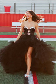 Fashionable Black A-Line Strapless Sleeveless Crystal-Trimmed Ruffled Tulle High-Low Prom Dresses with Slit