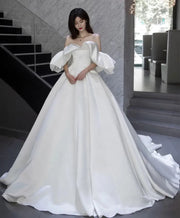 Glamorous A-Line satin Off-Shoulder Puff Sleeve Back Zip Floor-Length Wedding Dress ladies hot sale