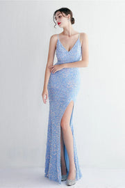 This light blue sequined mermaid dress features a deep V-neck and thin shoulder strap design, with a full layer of sequins that bring a sparkling shine. The slim fit fish tail design fits the curve, and the high side slit adds agility. The back cross strap style is exquisite and eye-catching, suitable for parties, dinners, and other occasions, showcasing a gorgeous temperament.