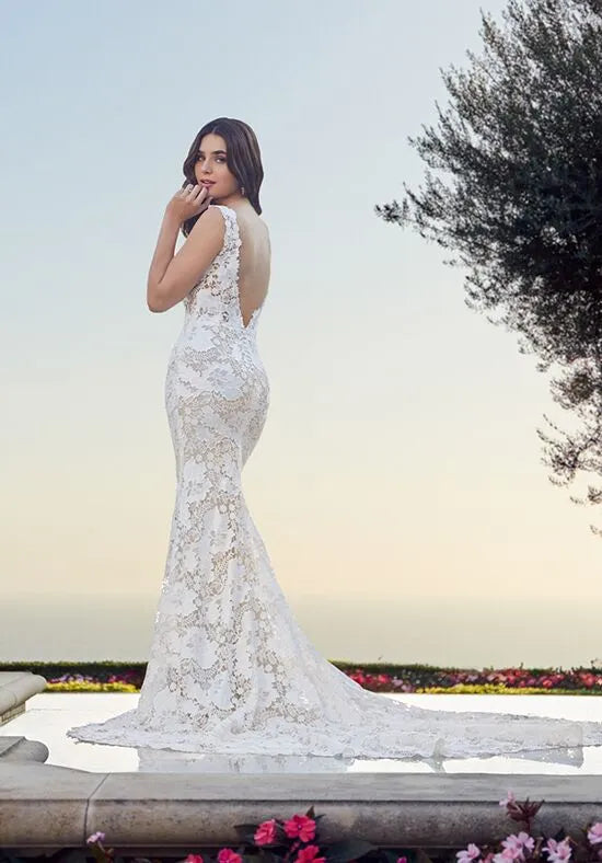 Glamorous Mermaid Plunge Neck Spaghetti Strap Lace Back Train Wedding Dresses - US 2 / UK 6 / EU 32