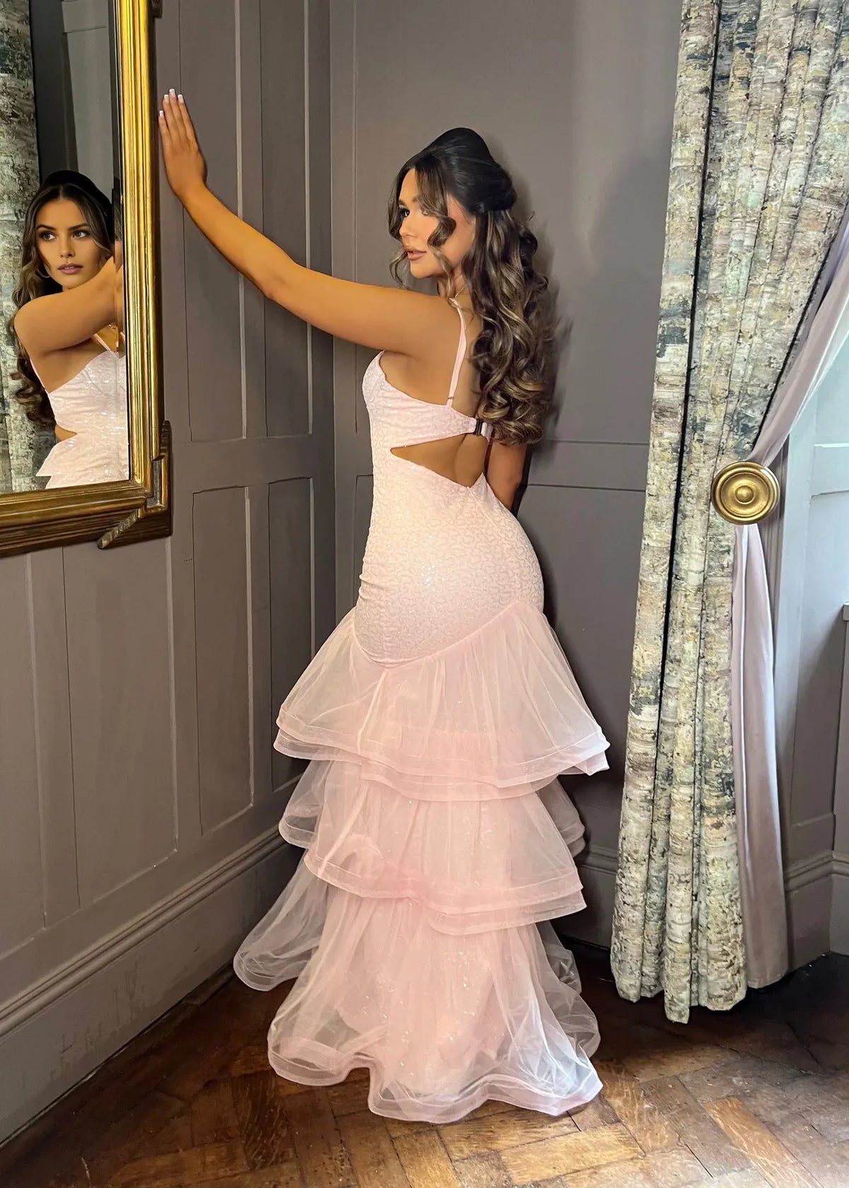 Sequin Tiered Tulle Prom Dress. Any accessories shown in the picture, such as a cape/jacket, gloves, veil, handbag, etc., are not included