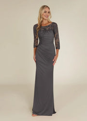 Glamorous Sheath Boat-Neck Three-Quarter-Sleeve Lace Ruched Illusion Back Zip Floor-Length Mother of the Bride Dress for female guests Hot Sale - US 2 / UK 6 / EU 32