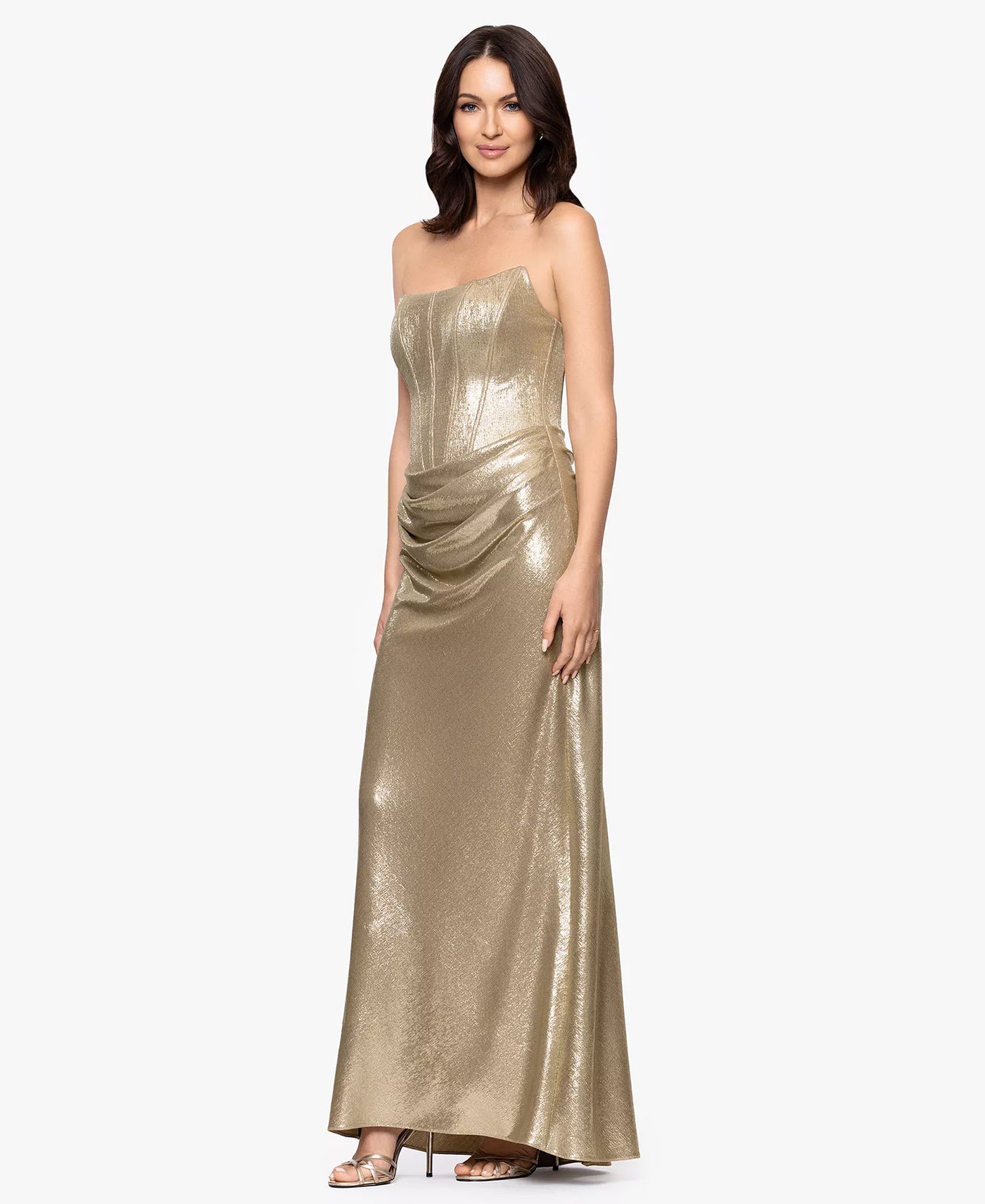 This glamorous party gown features a fitted, straight silhouette with a strapless neckline and a shimmering gold fabric, exuding a sophisticated and radiant feel. Ruffled details at the waist and a slit in the skirt add a touch of movement, while the cinched waist accentuates the figure. The long length makes it suitable for formal occasions such as evening events, making it a sophisticated and eye-catching choice.