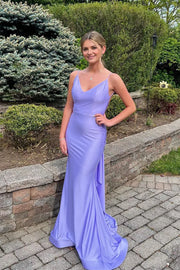 Step into the spotlight with this gorgeous sheath prom dress. It features a chic V - neckline and delicate spaghetti straps, beautifully highlighting your neckline and shoulders. The open - back detail adds an alluring touch, while the floor - length skirt in a soft lavender hue, with its figure - hugging silhouette and elegant train, ensures graceful movement. Perfect for prom nights, this dress lets you shine with confidence and elegance.