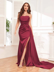This luxurious and shimmering ball gown is crafted from high-gloss satin. The strapless neckline and sleeveless design accentuate the shoulders and neck, while the fishtail silhouette hugs the body, showcasing elegant curves. A front slit adds a touch of sexiness, while the open back and cathedral train make it suitable for formal occasions such as balls and banquets, making it the top choice for those seeking a glamorous look.