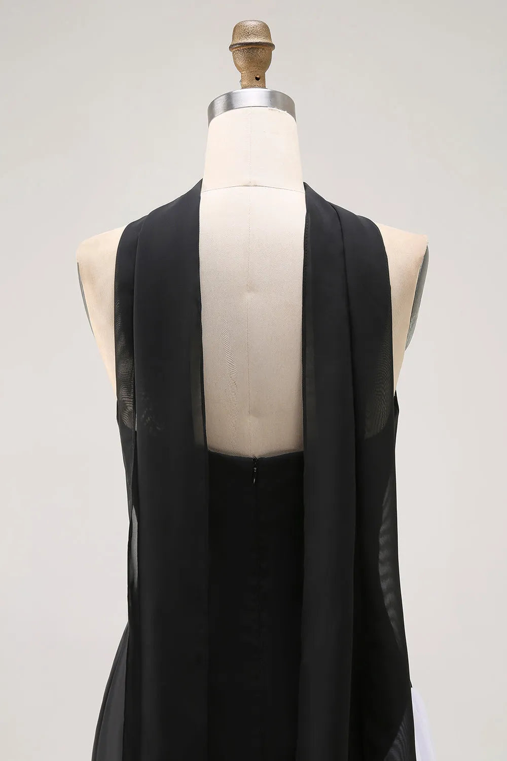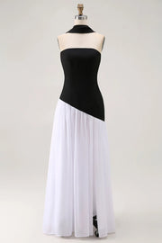 This modern bridesmaid dress features a striking black and white color-block design for a clean and sophisticated look. The strapless bodice and halter neck design accentuate the neck and shoulders, while the flowing A-line skirt adds a touch of elegance. The front slit adds a dynamic element, and the open back design combines sexiness with elegance. Suitable for urban banquets, wedding ceremonies, parties, and other occasions, this dress is a top choice for a sophisticated and stylish bridesmaid look.