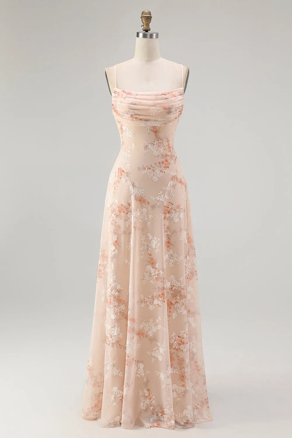 Romantic A-Line Cowl Neck Spaghetti-Strap Lace-Up-Back Floor-Length Bridesmaid Dresses