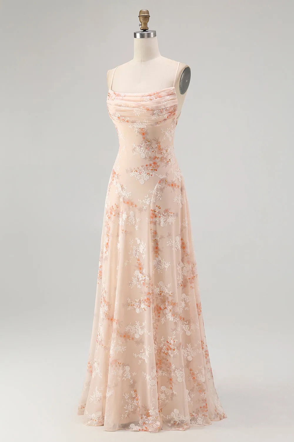 This romantic bridesmaid dress features a soft texture from lightweight printed chiffon. The draped neckline and thin straps flatter the neck and shoulders, while the flowing A-line skirt adds a touch of elegance. The adjustable crisscross back ties make it suitable for garden weddings, outdoor ceremonies, spring parties, and other occasions, making it a fresh and sweet choice for bridesmaids.