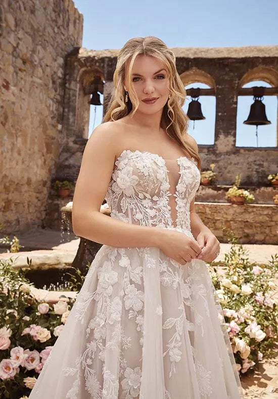 This light beige A-line dress presents a romantic and fresh temperament with a fluffy silhouette. The off shoulder collar design decorates the shoulders and neck, and the mesh fabric is paired with three-dimensional lace decoration. The lace backless details on the back are exquisite and dynamic, and the trailing skirt is suitable for rural style courtyard weddings, ceremonies, and other occasions. It is the preferred choice for gentle styling.