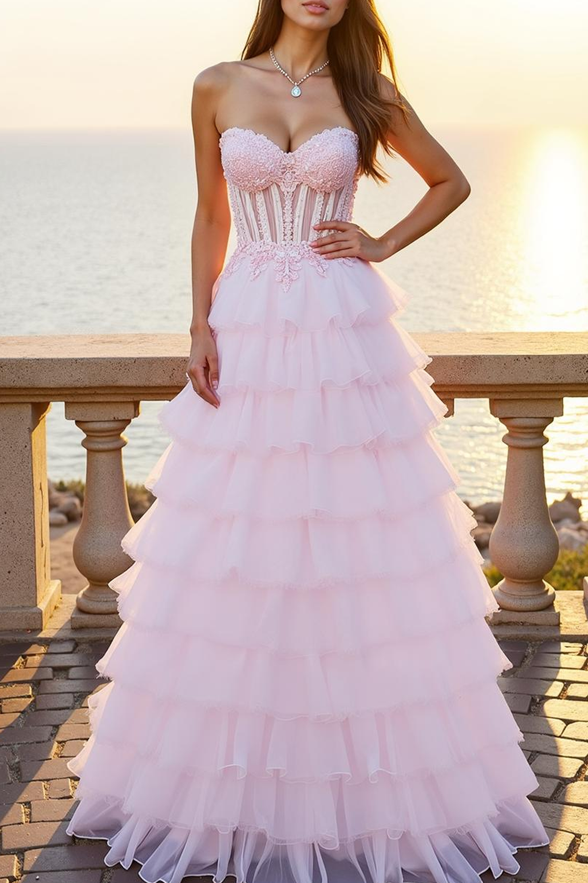 Romantic Pink Corset Strapless Tiered Back Zip Floor-Length Long Prom Dress with Appliques - US 2 / UK 6 / EU 32