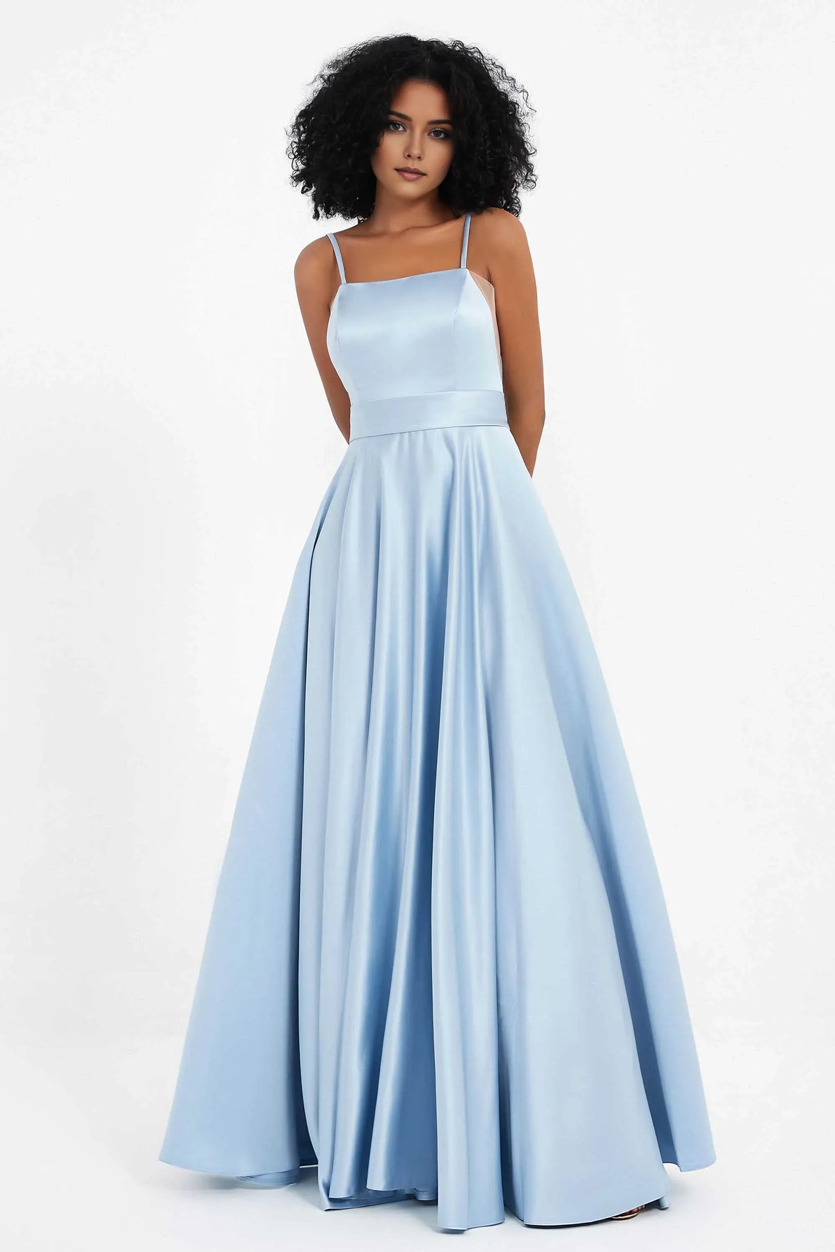 Simple Sky-Blue A-Line Square-Neck Spaghetti Straps Back Zip Backless Satin Ruched Floor-Length Prom Dresses - US 2 / UK 6 / EU 32