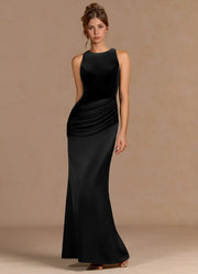 This black fishtail dress features a combination of velvet and satin to present a premium texture. The round neck design accentuates the neck line, while the pleated details at the waist fit the body. The exquisite and elegant keyhole design at the back and the high side slit add a touch of agility. It is suitable for formal occasions such as dinners and dances, and is the preferred choice for simple and atmospheric styling.