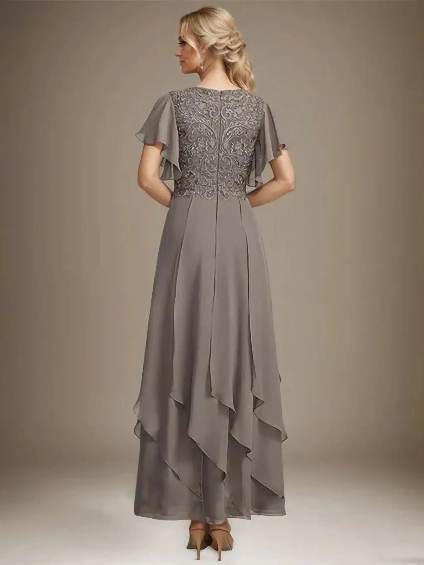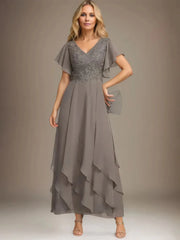 This sparkly mother of the bride dress features a flowy silhouette, V-neckline, and flutter sleeves, paired with a lace-back design and floor-length hem. Adorned with beaded embroidery on the bodice and layered chiffon skirt, it balances glamour and comfort—ideal for wedding celebrations.