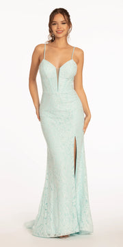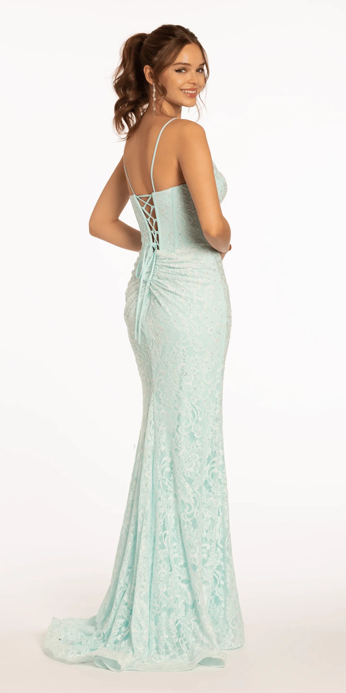 This mint green lace gown features a fitted mermaid silhouette that hugs the figure. The sweetheart neckline and delicate straps exude femininity, while the all-over lace pattern is adorned with tiny, sparkling rhinestones that shimmer in the light. A side slit adds a touch of dynamism, and the adjustable back tie allows for a comfortable fit. The flowing train creates a regal presence as you walk, making it an ideal choice for important occasions such as balls, banquets, and weddings.