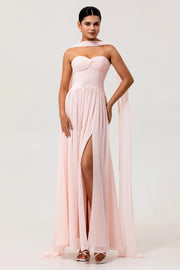 This ethereal bridesmaid dress features a soft, lightweight chiffon fabric. The heart-shaped strapless bodice and halter neck ribbon design flatter the shoulders and neck, while the flowing A-line skirt adds a touch of elegance. The front slit enhances the overall movement, and the open back design combines sexiness with elegance. It's perfect for beach weddings, garden ceremonies, outdoor parties, and other occasions, making it a romantic and sweet choice for bridesmaids.