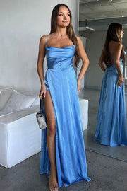 This luxurious slim fit bridesmaid dress features a square neckline and thin shoulder straps, with back strap details paired with bright blue satin material. The high side slit hem of the skirt is elegant and dynamic. Its glossy fabric is suitable for weddings, formal dinners, and other occasions, highlighting the curves of the body while conveying a high-end romantic style with fresh colors.