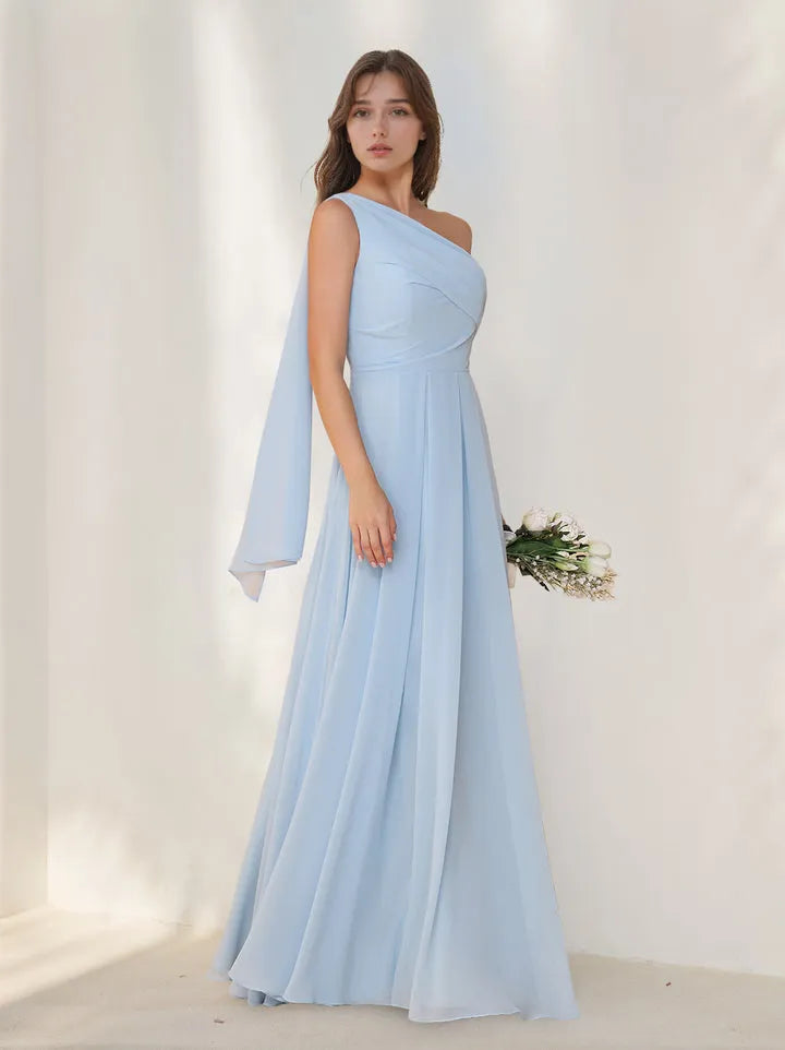 Romantic A-Line One-Shoulder Sleeveless Drape Back Floor-Length Bridesmaid Dresses