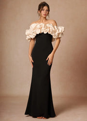 This black and white contrasting dress presents an eye-catching temperament with a Mermaid silhouette, featuring off shoulder and large ruffled sleeves to embellish the shoulders and neck. The crisp fabric is paired with contrasting details, and the fishtail skirt fits the curves of the body, making it a stylish and layered choice for occasions such as dinners.