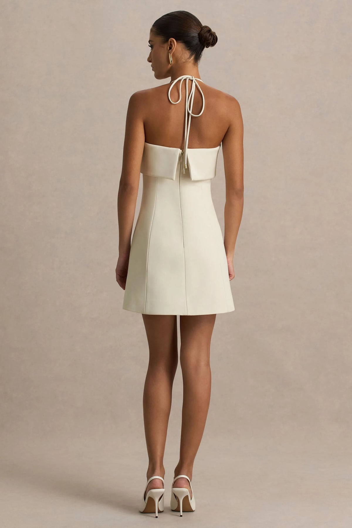 This stylish backstage prom dress features a fitted, straight silhouette with a strapless and halter neckline. The off-white fabric exudes a simple yet sophisticated feel. The back tie detail is delicate and eye-catching, while the short length is sleek and elegant, making it suitable for backstage prom, parties, and other occasions. It's a modern yet sophisticated choice.