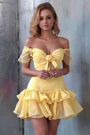 This vibrant back-to-school dress features a fitted flared silhouette, a sweetheart neckline, and off-the-shoulder sheer sleeves. The bright yellow fabric is fresh and eye-catching. A bow at the chest and tiered ruffles at the hem add a touch of dynamism. The cropped style is perfect for party occasions, making it a sweet yet fashionable choice for back-to-school dances.