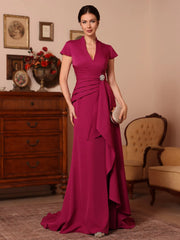 This glamorous mother of the bride dress features a fitted silhouette, V-neckline, and short sleeves, paired with a button-back design and train-length hem. Crafted from smooth satin with a ruffled detail and embellished waist, it blends elegance and sophistication—ideal for wedding celebrations.