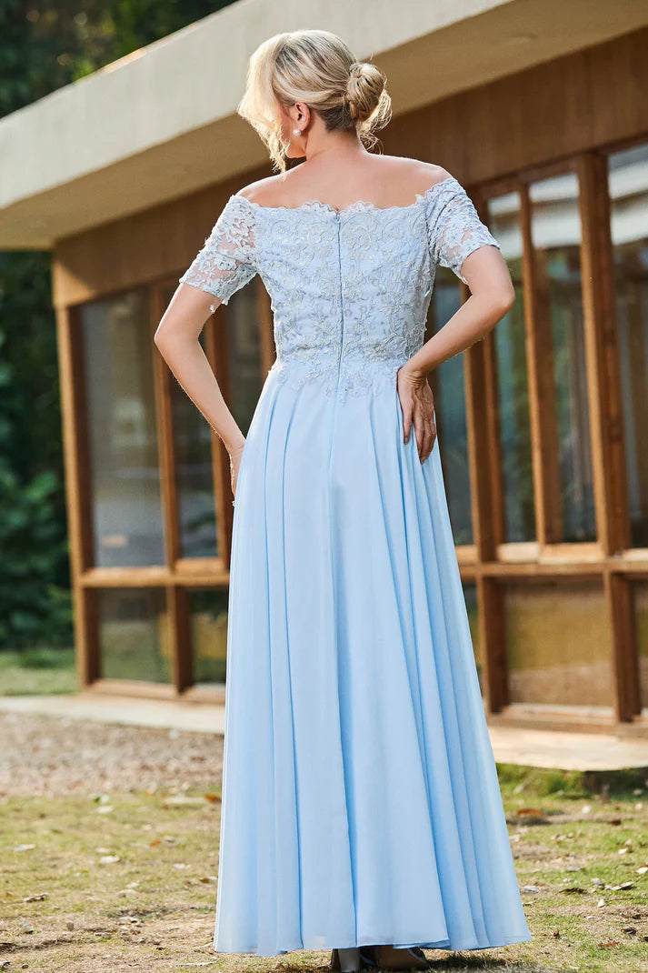 This romantic and elegant wedding mother's dress is made of light blue chiffon. The off-the-shoulder and short-sleeved lace design combines elegance and sophistication. The three-dimensional lace embroidery on the bodice is romantic and retro, while the A-line skirt flows gracefully. The buttons on the back enhance the details and texture. The loose fit is flattering and suitable for formal occasions such as outdoor weddings and banquets. It is the first choice for mature women who pursue an elegant and romantic style.