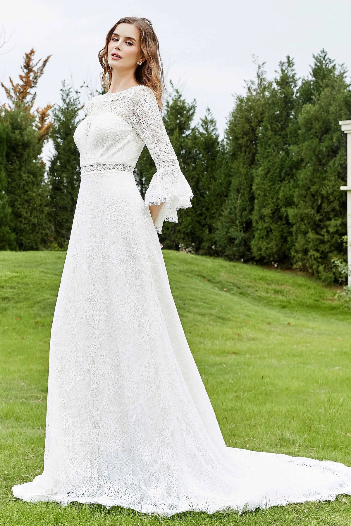 This white lace wedding dress features a boat shaped collar and flared sleeves design, with a slim fit that fits the body. The exquisite lace texture on the whole body is retro and elegant, with flared sleeves adding soft details. The exposed keyhole design on the back is exquisite, and the trailing design is suitable for outdoor weddings, showcasing a gentle and high-end quality.