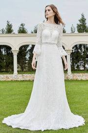 Elegant Sheath Boat Neck Bell Sleeve Keyhole Back Long Wedding Dresses
